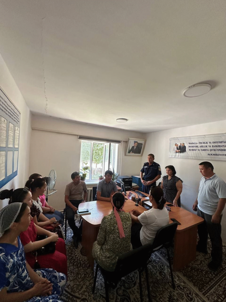 O‘zbekiston Respublikasi Prezidentining 2025-yil 3-yanvardagi «2025-yilda respublika mahallalarida xavfsiz muhitni yaratish va huquqbuzarliklarning barvaqt oldini olish tizimi samaradorligini yanada oshirish bo‘yicha chora-tadbirlar to‘g‘risida»gi PQ-1-sonli qarori ijrosini ta’minlash maqsadida Respublika ixtisoslashtirilgan ruhiy salomatlik ilmiy-amaliy tibbiyot markazining narkologiya xizmati bo‘yicha Qoraqalpog‘iston Respublikasi filiali reja jadvaliga asos filial direktori A.D.Esboganova va filial shifokori A.Djalilov 2025-yil 24-iyul kuni Bozatov tumani «Qusqanatov» QFY fuqarolari va Bozatov obodonlashtirish bo‘limida ishlovchi xodimlari bilan davra suhbati o‘tkazilib, fuqarolarga jamoat joylari va turar joylarda xavfsiz muhit yaratish, fuqarolarning hayoti, sog‘lig‘i va mol-mulkiga har qanday tajovuzlarning oldini olish maqsadida tegishli soha mutaxassislari tomonidan fuqarolarga profilaktik tushuntirish ishlari amalga oshirildi.